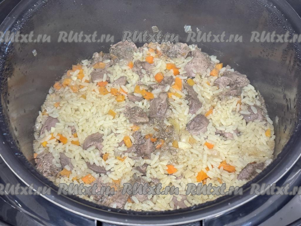 Перемешать рис с овощами и куриной печенью, закрыть крышку мультиварки. Выставить режим "Плов" на 30 минут. После звукового сигнала, означающего окончание режима, блюдо будет готово. Перемешать.