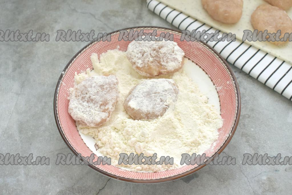 Заготовки наггетсов сначала обваливаем в муке со всех сторон.