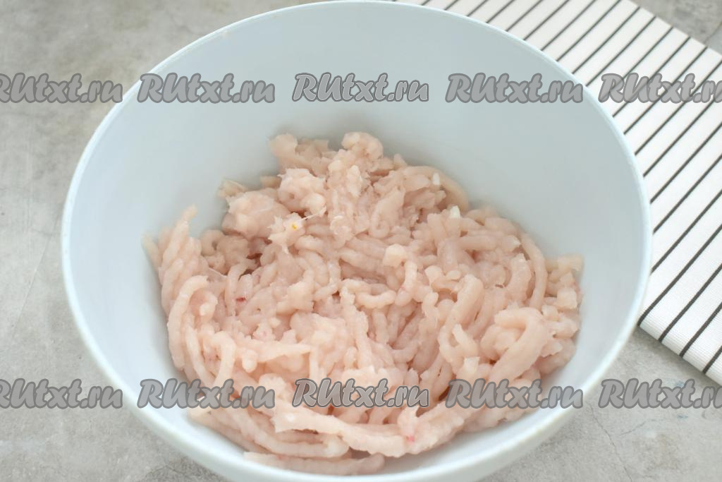 Для приготовления наггетсов я использовала домашний куриный фарш, предварительно пропустив куриное филе через мясорубку. Можно взять и покупной фарш. Перекладываем фарш в миску.