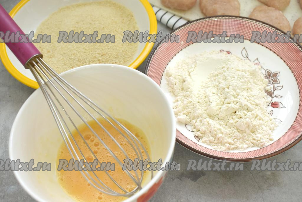 Затем куриные наггетсы из фарша с двух сторон окунаем в яичный кляр.
