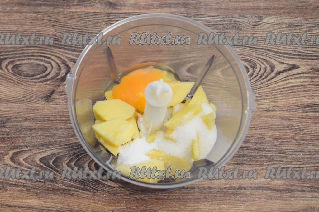 В чашу измельчителя выложить нарезанные яблоки, всыпать сахар и разрыхлитель, вбить сырое яйцо.