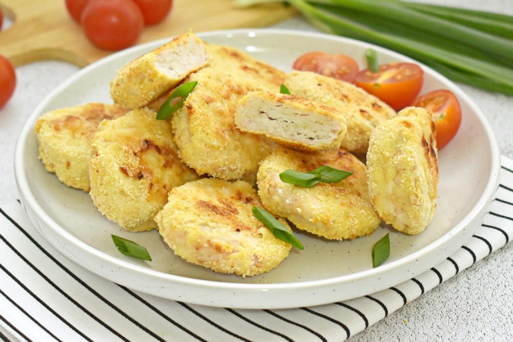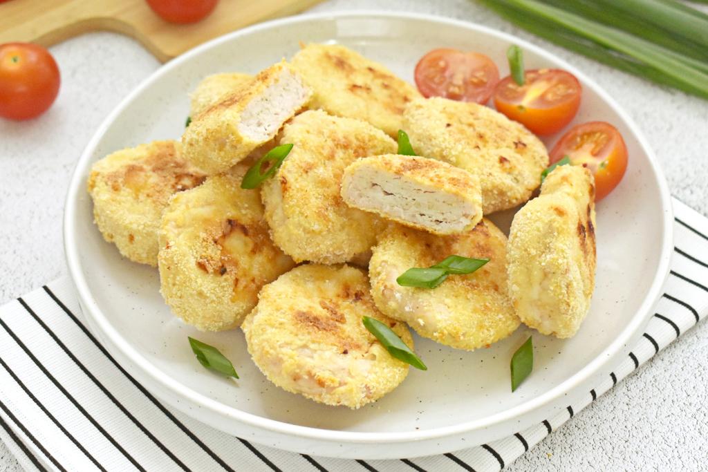 Аппетитные наггетсы из куриного фарша, хрустящие снаружи и нежные внутри, достаём из духовки и горячими подаём к столу, дополнив любимым соусом, гарниром или салатом из свежих овощей.