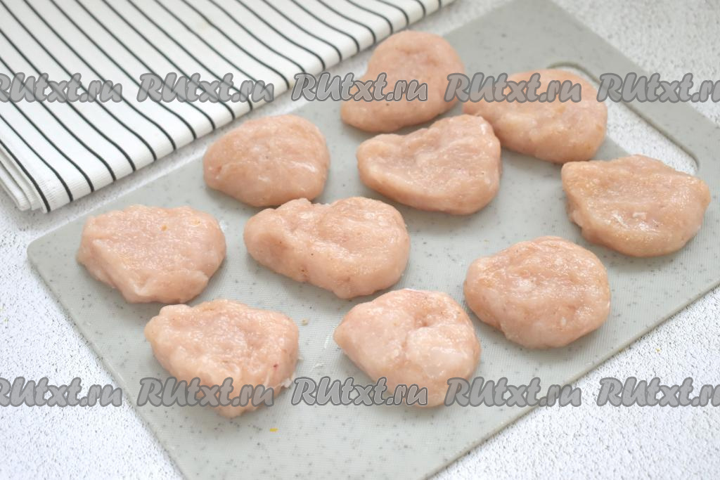 Из куриного фарша формируем заготовки в виде наггетсов (у меня получились 10 заготовок наггетсов). Для того чтобы фарш меньше приставал к рукам в процессе формирования наггетсов, советую ладони периодически смачивать водой.