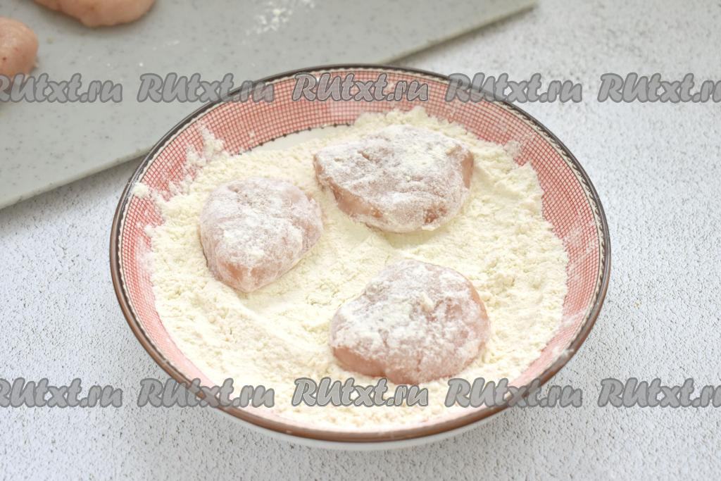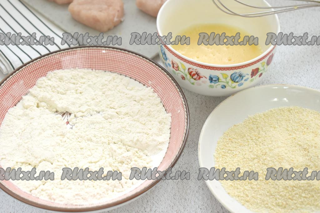 Заготовки наггетсов из куриного фарша обваливаем сначала в муке со всех сторон.