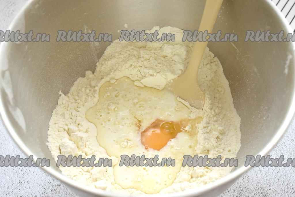 Пока варится картошка, займёмся замешиванием теста для кыстыбыя. Кефир можно взять любой жирности (у меня - жирностью 3,2%). Желательно, чтобы кефир был комнатной температуры (я подогрела его в течение 20 секунд в микроволновке, можно просто заранее достать его из холодильника). В достаточно объёмную миску просеиваем 350 грамм муки, вливаем кефир, добавляем растительное масло, сырое яйцо, соль, сахар, соду.