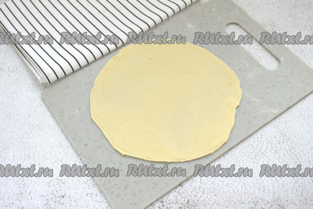 На слегка присыпанной мукой поверхности вначале одну часть теста раскатываем в тонкую лепёшку толщиной 2 миллиметра, ориентировочно диаметром 16 сантиметров. Края лепёшки я подравняла, приложив сверху тарелку диаметром 16 сантиметров и отрезав лишнее тесто.