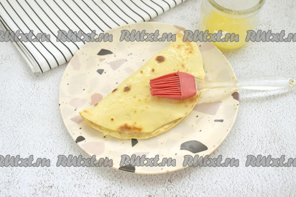 Накрываем картофельную начинку свободной стороной лепёшки, формируя кыстыбый. Растапливаем сливочное масло (я растопила в микроволновке). Горячий кыстыбый с картошкой щедро смазываем растопленным сливочным маслом с двух сторон, благодаря этому лепёшка станет нежной и мягкой. Постепенно жарим все лепёшки, а затем вкладываем в них начинку и обязательно смазываем горячие кыстыбыи растопленным маслом с двух сторон.
