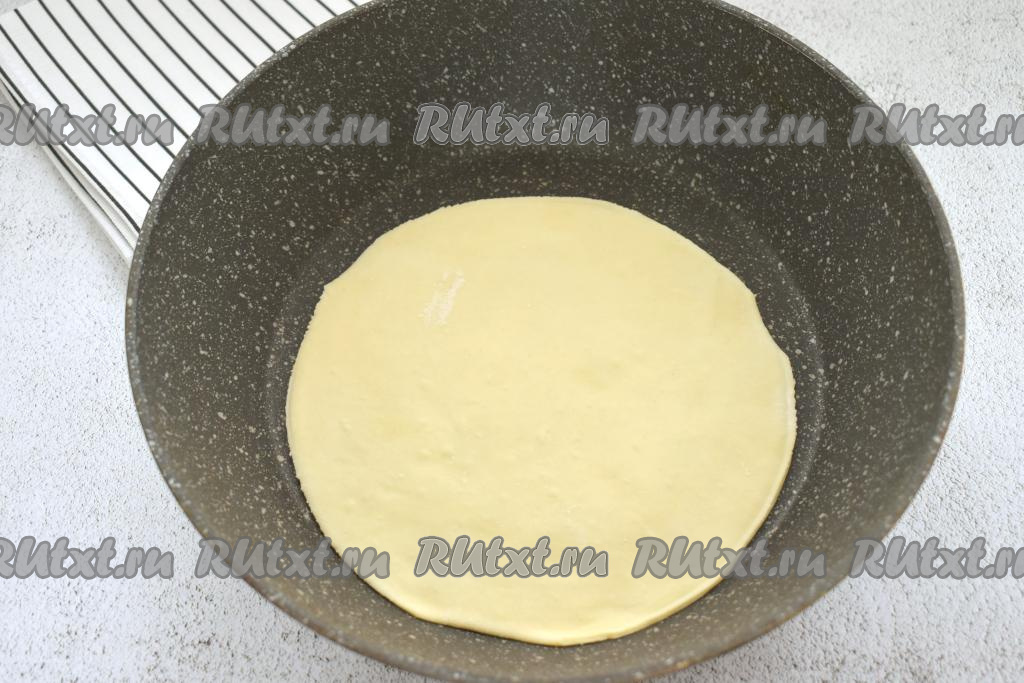 Разогреваем хорошо сухую сковороду (смазывать сковородку маслом не нужно). Выкладываем на горячую сковороду лепёшку и обжариваем её до подрумянивания с двух сторон (примерно по 30-40 секунд) на среднем огне. Лепёшка должна подрумяниться с каждой стороны, но важно её не пересушить, чтобы она не ломалась при формирования кыстыбыя.