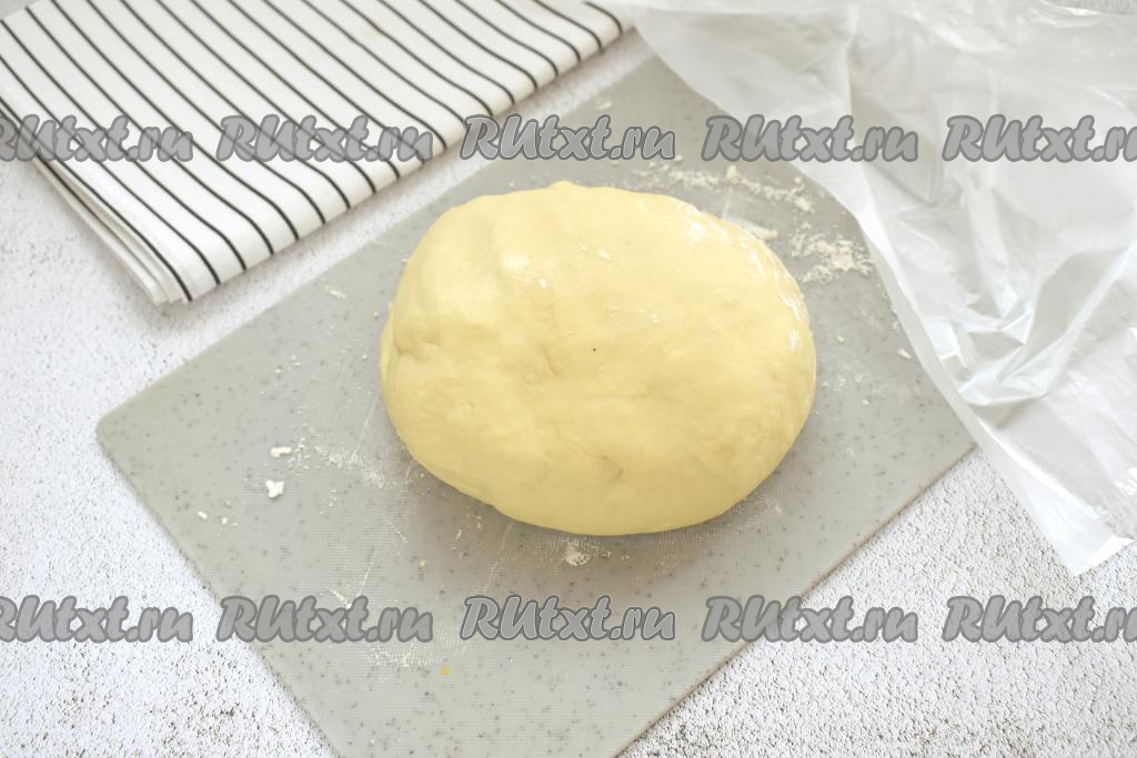 Вначале перемешиваем тесто для кыстыбыя лопаткой, а после того как оно начнёт собираться в ком, начинаем замешивать его руками. Вымешивать это тесто нужно 7-8 минут, всыпая понемногу, по мере необходимости, оставшуюся муку. Вымешивая тесто и всыпая муку, учитывайте, что тесто должно получиться мягким, эластичным, не липнущим к ладоням. Как только добились нужной консистенции теста, значит больше муку добавлять не нужно. Кладём замешанное тесто в целлофановый пакет и убираем в холодильник на 15 минут.