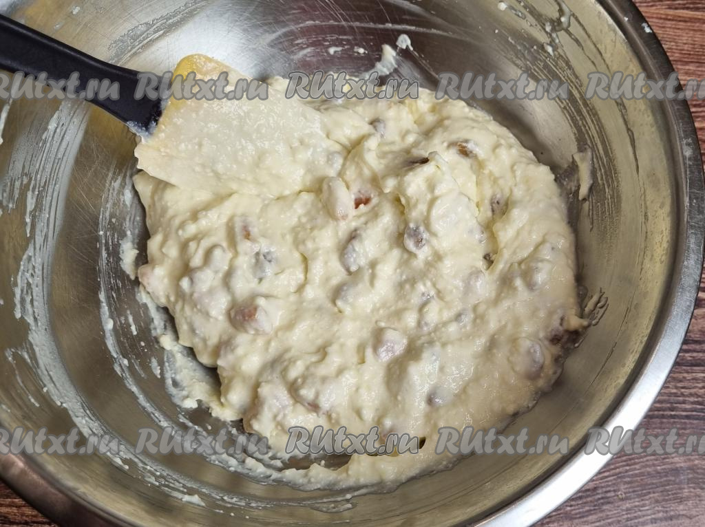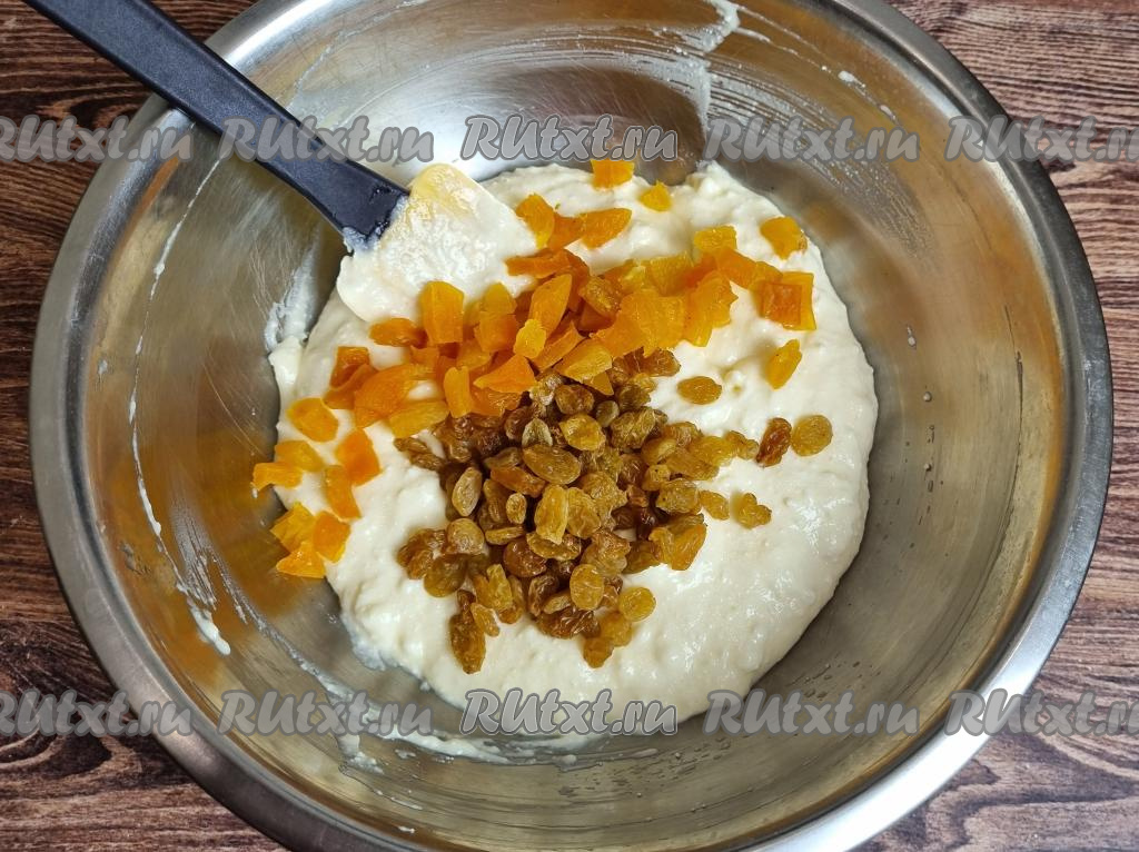 Всыпать в творожную массу обсохший изюм и кусочки кураги.