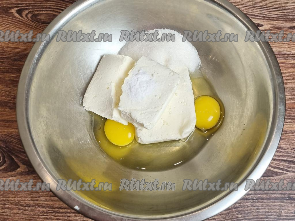 В достаточно объёмную миску выложить творог, сразу добавить яйца, сахар, соду, растереть лопаткой (или вилкой) до получения однородной творожной массы.