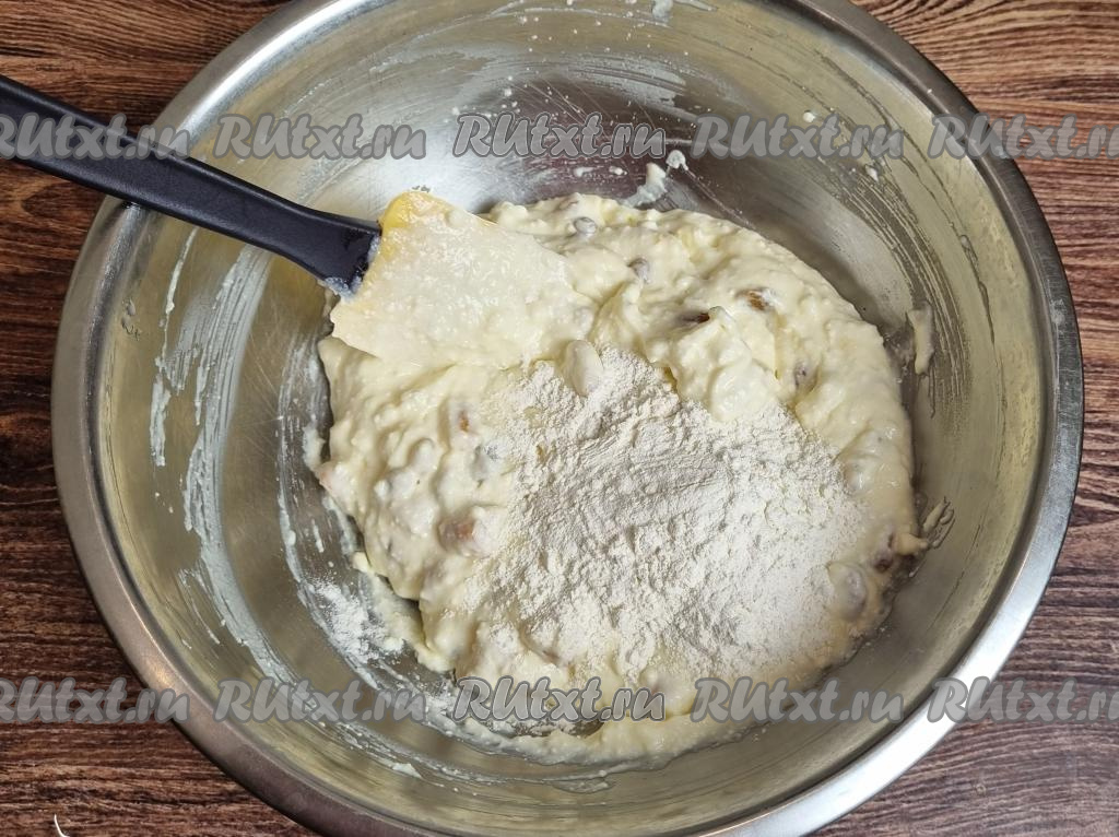 Вмешать муку в тесто лопаткой. Далее подсыпать муку по половине столовой ложки, контролируя густоту замешиваемого теста. Тесто для запеканки должно получиться достаточно густым, вязким, как на фото.