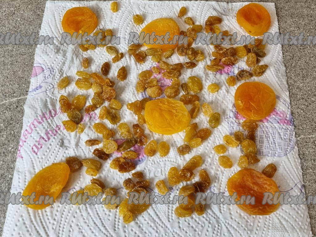 Изюм и курагу промыть водой, выложить в небольшую ёмкость, полностью залить сухофрукты кипящей водой, оставить минут на 7-10. Затем откинуть распарившиеся сухофрукты на сито, дать лишней воде стечь. Разложить изюм и курагу на бумажном полотенце. Осмотреть изюм, удаляя веточки, если они есть. Дать изюму и кураге обсохнуть.