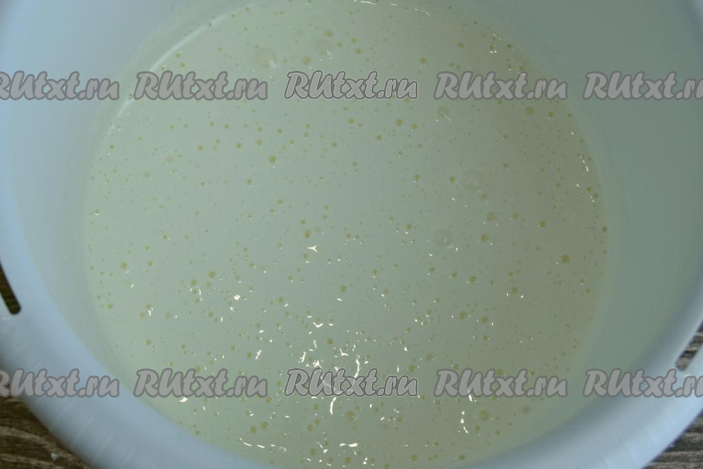 На максимальных оборотах миксера взбить яйца с сахаром в течение 5 минут. Яичная масса в процессе взбивания должна побелеть и увеличиться в объёме.