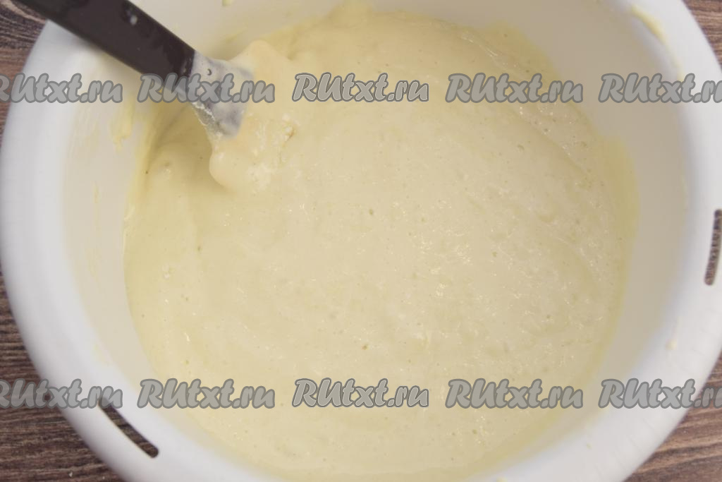 Постепенно подсыпая оставшуюся просеянную муку и хорошо вмешивая её, замесить воздушное, однородное бисквитное тесто, которое по консистенции будет напоминать сметану средней жирности.