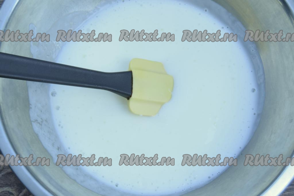 В миску влить кефир, всыпать соду, перемешать и оставить на 5 минут. Кефир за это время вступит в реакцию с содой, поэтому немного увеличится в объёме, на его поверхности появятся пузырьки.