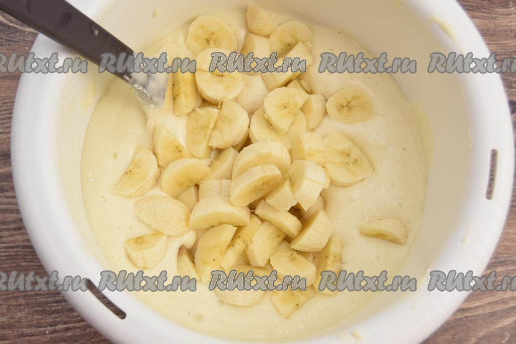 Аккуратно вмешать бананы в тесто, стараясь не сбить воздушность бисквитного теста, но при этом равномерно распределяя бананы по всему тесту.