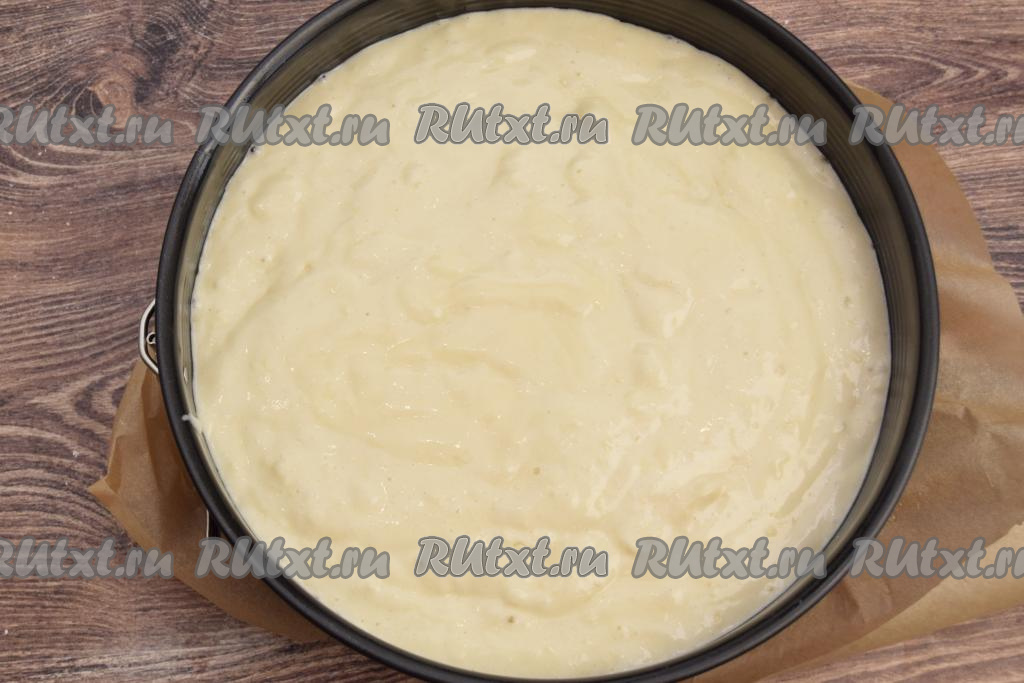 Дно разъёмной формы для выпечки (я взяла форму диаметром 23 сантиметра) застелить пергаментом. Бока и пергамент, которым застелено дно формы, смазать растительным маслом, чтобы готовая шарлотка легче отходила от боков формы после выпечки.