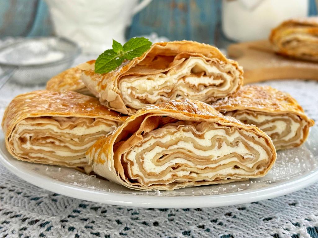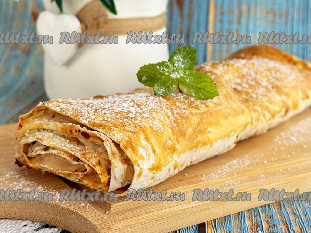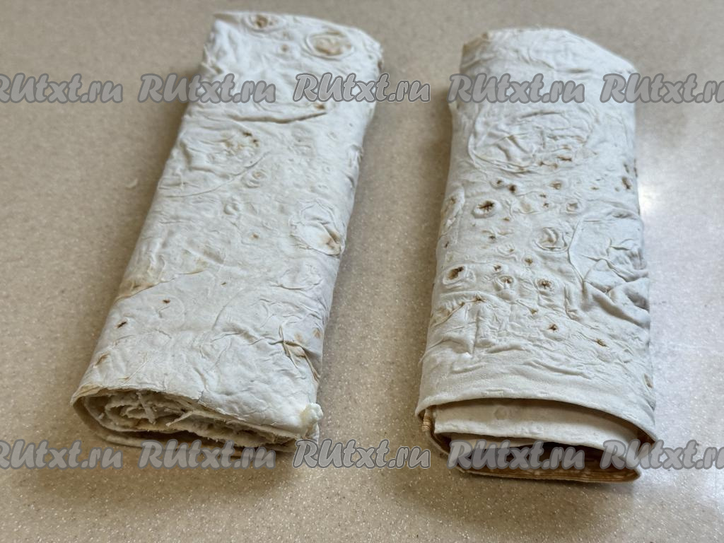 Свернуть лаваш с творогом в плоский рулет, начиная с более узкой стороны.