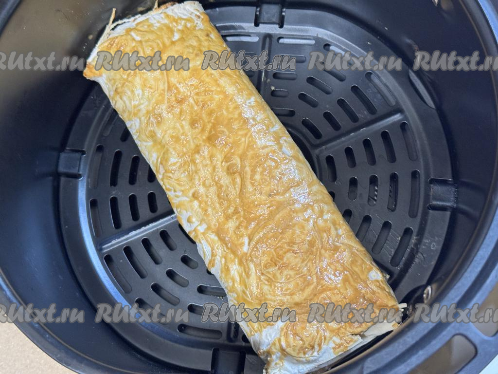 Рулет из лаваша целиком не поместится в чашу аэрогриля, поэтому его нужно разрезать на 2 части.