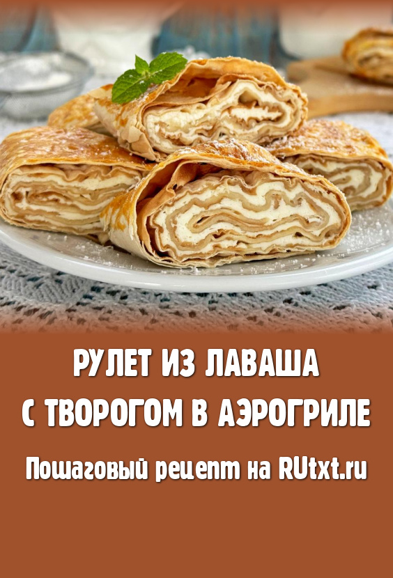 Готовый рулет с творогом достать из аэрогриля. Запечь в аэрогриле вторую часть рулета из лаваша. Готовый рулет выложить на разделочную доску, дать немного остыть, по желанию, присыпать сверху сахарной пудрой.