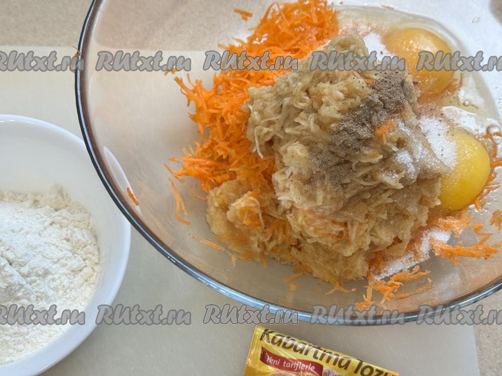 В миску с морковью и яблоками добавить яйца, сахар и корицу.