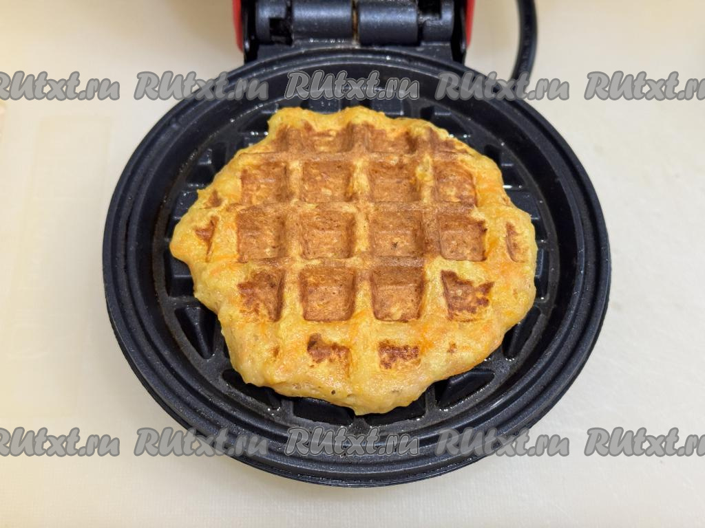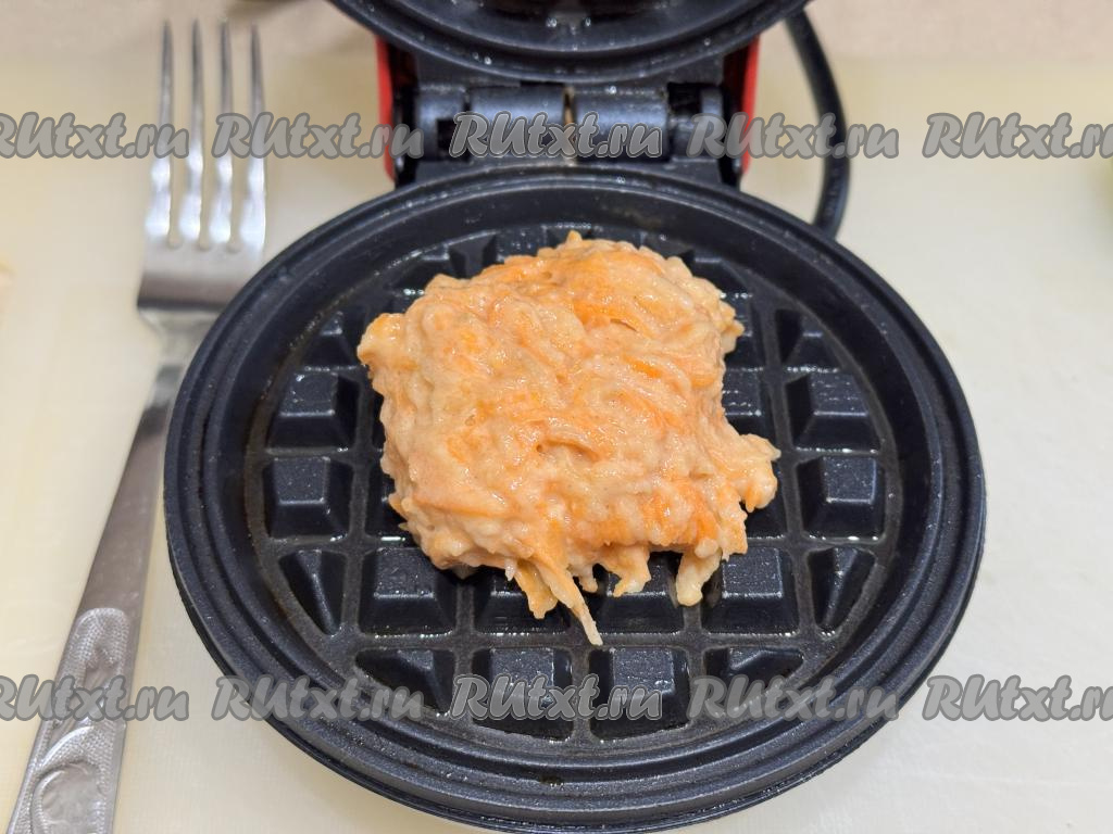 Вафельницу хорошо разогреть, смазать створки вафельницы растительным маслом, затем выложить 1 столовую ложку морковно-яблочного теста.