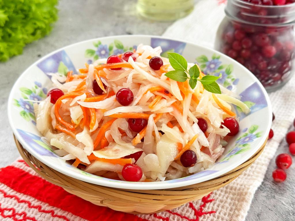 Перемешать капусту с морковью, добавить клюкву.