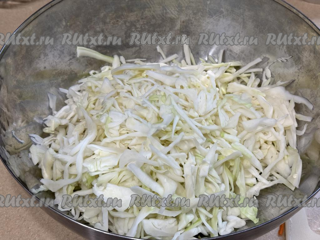 Пока маринад закипает и варится, займёмся овощами. 1 килограмм капусты нужно нарезать на тонкие полоски, сложить в глубокую миску.