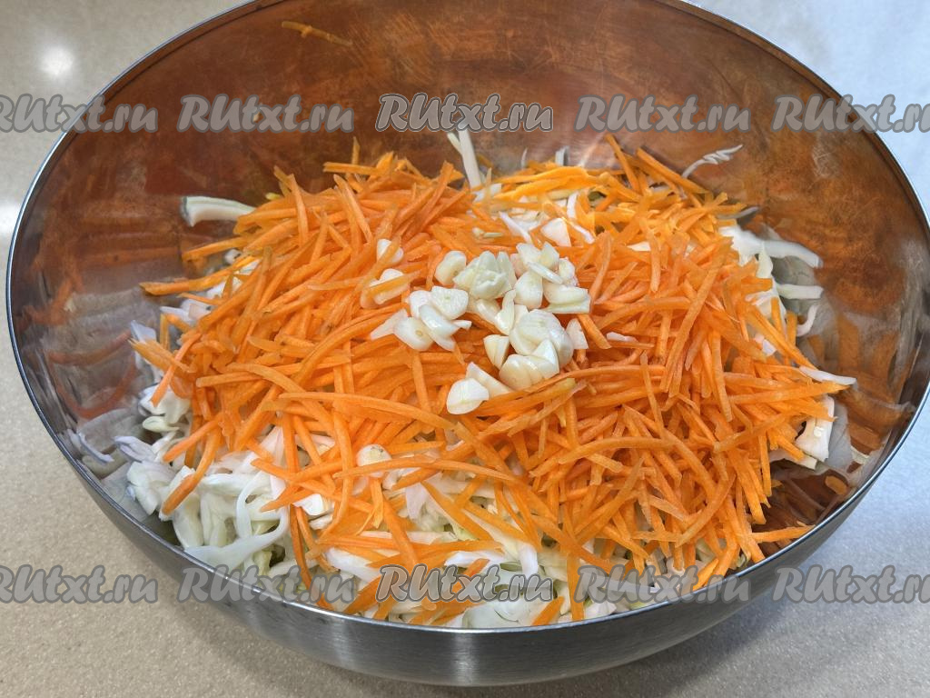 В миску с капустой добавить морковку, натёртую на крупной тёрке, и нарезанный на достаточно тонкие пластинки чеснок.