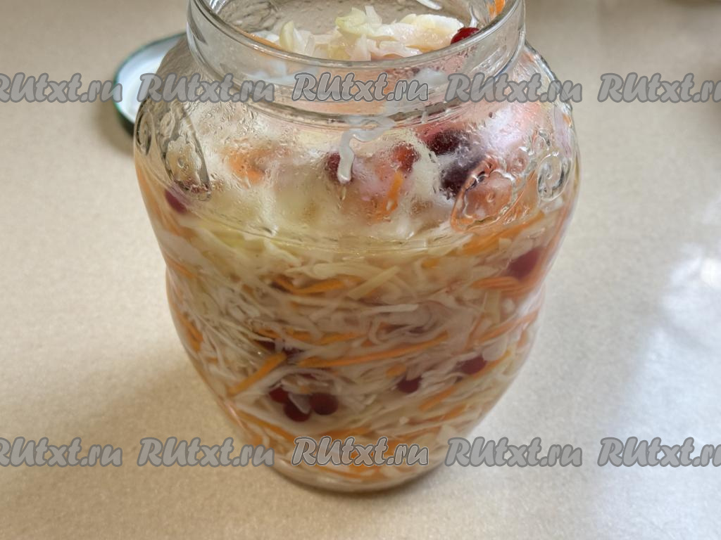 Капусту с морковью и клюквой выложить в банку (я взяла банку объёмом 2 литра), влить очень горячий маринад. Оставить банку на кухонном столе до полного остывания.