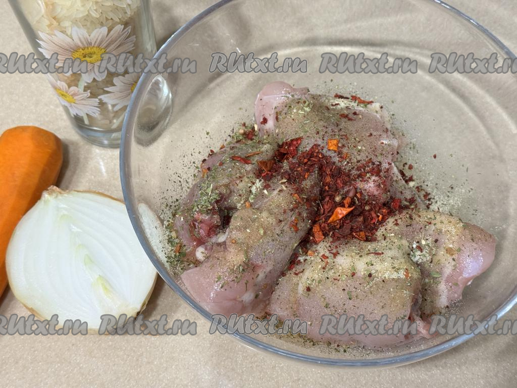 С куриных бёдер, по желанию, снять кожу. Выложить подготовленные бёдрышки в миску, добавить соль и специи (в качестве специй я использовала соль, смешанную со специями, и специи для курицы). Тщательно перемешать, покрывая части курицы солью и специями со всех сторон.