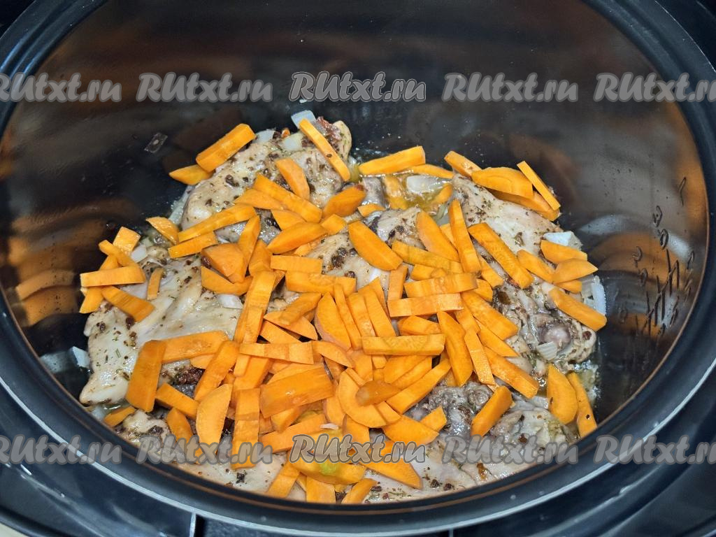 К бёдрышкам, обжаренным с луком, добавить морковь, нарезанную на достаточно тонкие брусочки (или натёртую на крупной тёрке), аккуратно перемешать, обжарить в течение 5 минут, иногда помешивая.