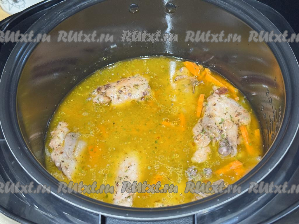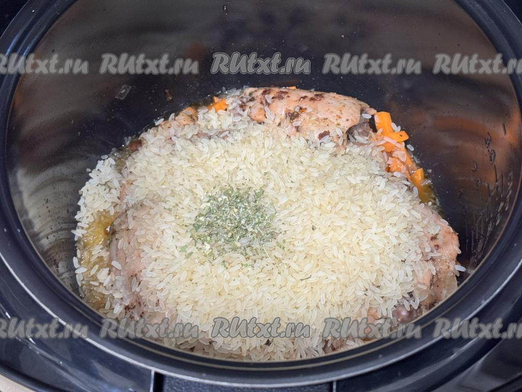 Влить воду комнатной температуры, перемешать куриные бёдра с рисом. Выставить режим "Плов" на 40 минут, крышку мультиварки закрыть.