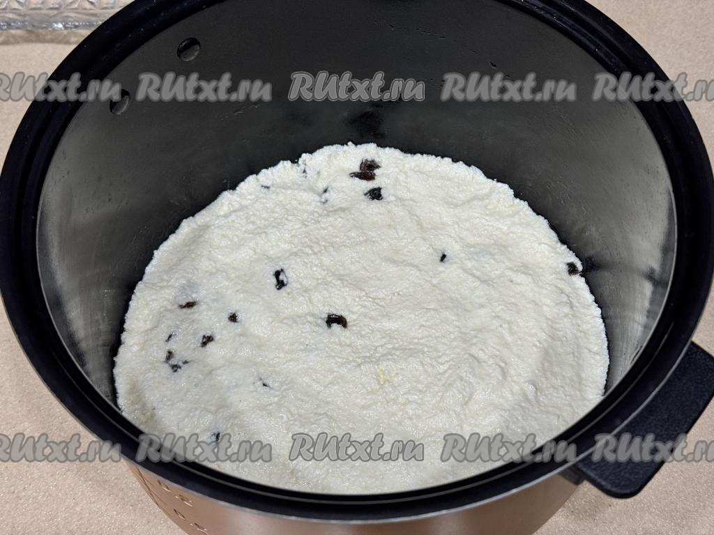 Крышку мультиварки закрыть. Выпекать творожную запеканку с изюмом на режиме "Выпечка" 1 час.
