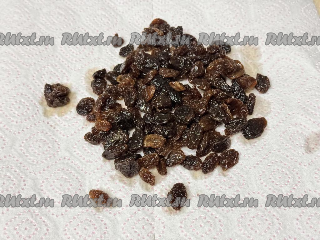 Пока манка набухает, можно заняться изюмом. Его нужно выложить в миску, залить полностью кипящей водой и оставить минут на 5, после этого откинуть на сито, чтобы стекла лишняя вода. Разложить изюм на бумажном полотенце, дать ему обсохнуть.