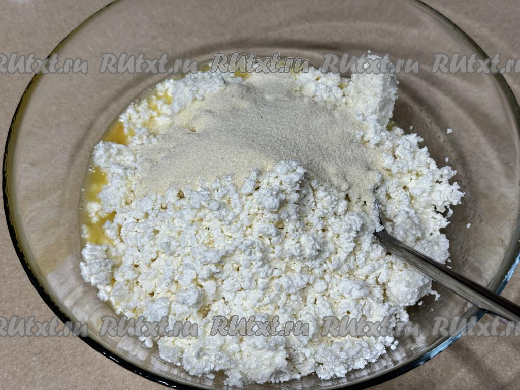 Перемешать творожную массу столовой ложкой до однородности, она должна получиться густой и вязкой, как на фото. Если творожная масса получилась жидковатой (многое зависит от влажности творога и от величины яиц), тогда добавьте ещё 0,5-1 столовую ложку манки, добиваясь нужной густоты творожно-манного теста. Оставить тесто на 30 минут, чтобы манка набухла.