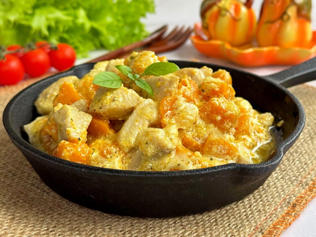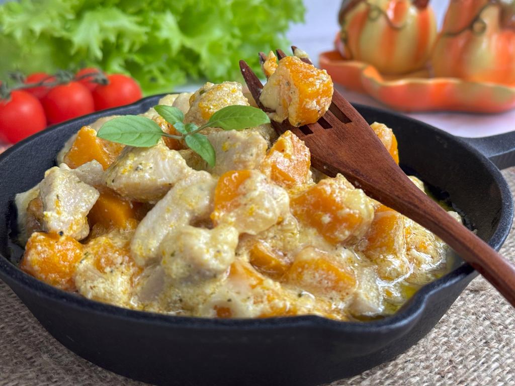 Предлагаю разнообразить меню и на обед или к ужину приготовить мясо курицы, тушёное с кусочками тыквы в сливочном соусе на сковороде. Блюдо получается очень аппетитным, вкусным, насыщенным. Нежные кусочки курицы отлично сочетаются с мягкими кусочками тыквы, а сливки в процессе томления объединяют все ингредиенты, создавая гармонию вкусов. К столу это сытное блюдо можно подать с любым гарниром (я предпочитаю подавать с рисом).
