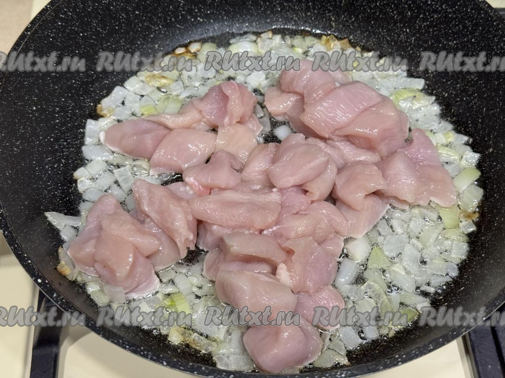Обжарить лук на среднем огне до прозрачности (в течение 3-4 минут), иногда помешивая. После того как лук станет прозрачным, добавить к нему куриное мясо, нарезанное на средние кусочки, перемешать.