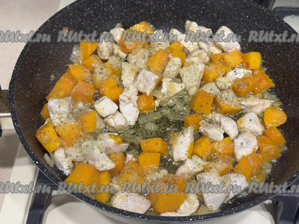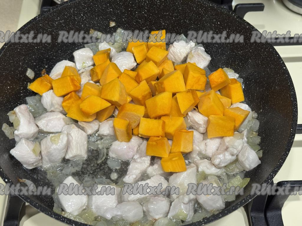 180 грамм тыквы, заранее очищенной от кожуры и волокон с семечками, нарезать на кубики примерно такого же размера, как нарезано мясо курицы. Добавить тыкву к обжаренной курице, перемешать.