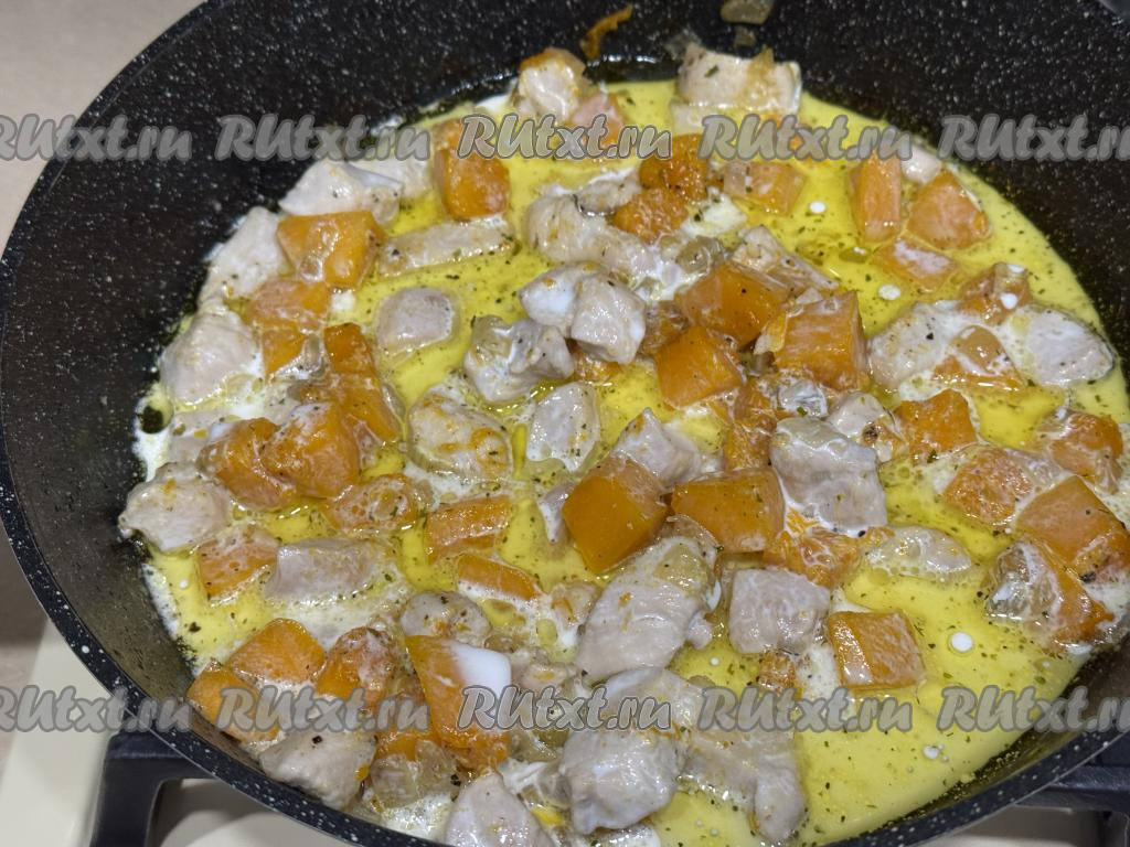 Влить в сковороду сливки, перемешать. Дать сливками закипеть, сразу уменьшить огонь. Томить мясо курицы с тыквой в сливочном соусе 5-7 минут, иногда перемешивая.