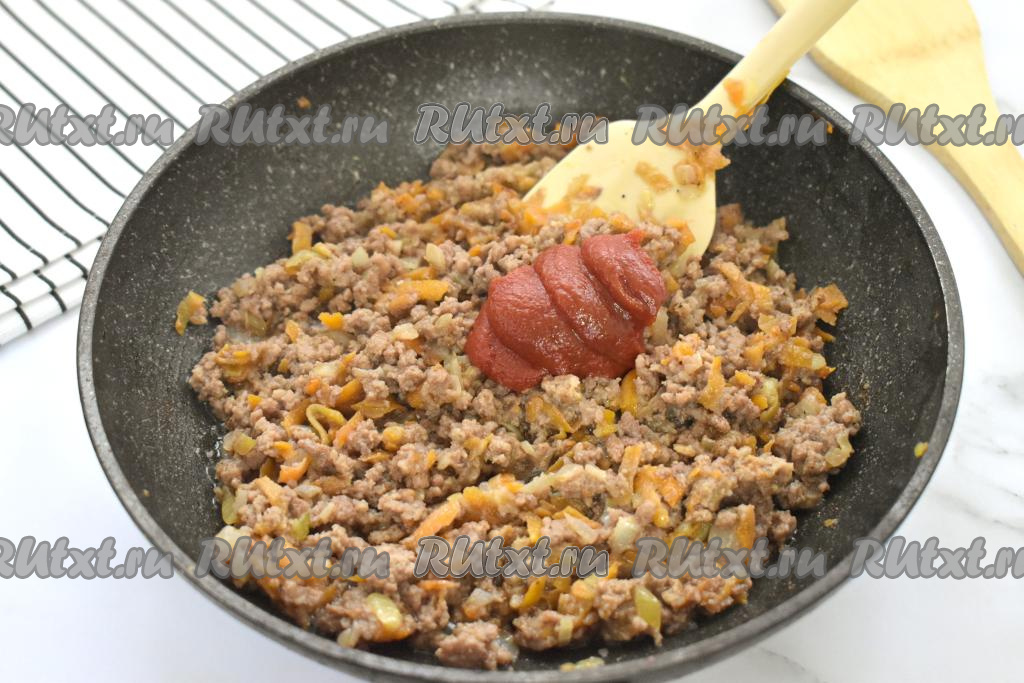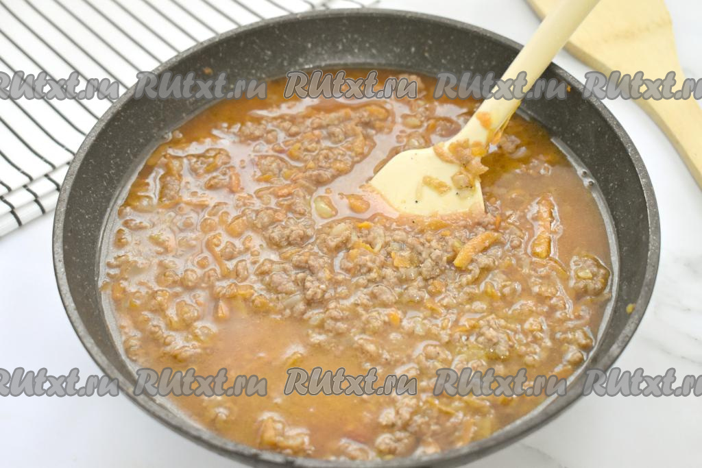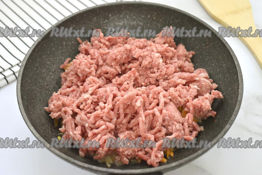 После того как морковь станет мягкой, выкладываем к обжаренным овощам мясной фарш, перемешиваем. Обжариваем фарш, часто разбивая комочки мяса, минут 10-15.