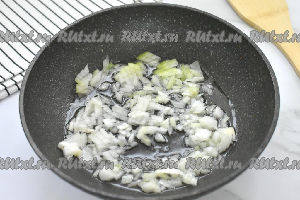 Для этого блюда можно взять фарш, приготовленный из одного или нескольких видов мяса (например, из свинины, индейки, курятины, говядины). В домашних условиях для получения фарша нужно пропустить кусочки мяса через мясорубку. Можно использовать и покупной фарш (я использовала покупной фарш из говядины). Очищаем лук, нарезаем мелко. Прогреваем растительное масло в сковороде, выкладываем нарезанный лук и обжариваем его до мягкости (минуты 3-4), иногда помешивая, на среднем огне.