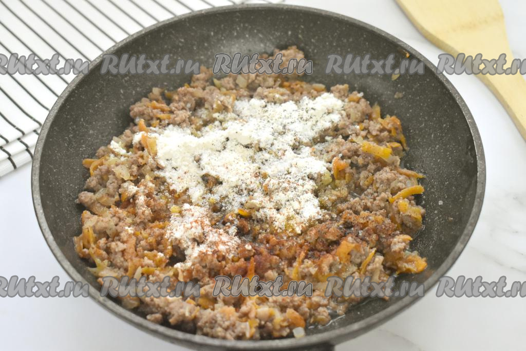 Затем к фаршу, обжаренному с овощами, добавляем муку, специи (у меня - паприка и чёрный молотый перец), солим. Перемешиваем, равномерно распределяя муку по фаршу.