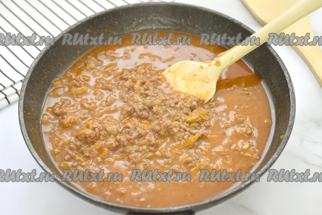 После закипания томатного соуса убавляем огонь до минимума, пробуем соус на вкус, если нужно, досаливаем. Если томатная паста кисловата, можно добавить в соус маленькую щепотку сахара. Накрываем сковороду крышкой, тушим фарш минут 10. В процессе тушения можно блюдо 1-2 раза перемешать. Готовое блюдо убираем с огня.
