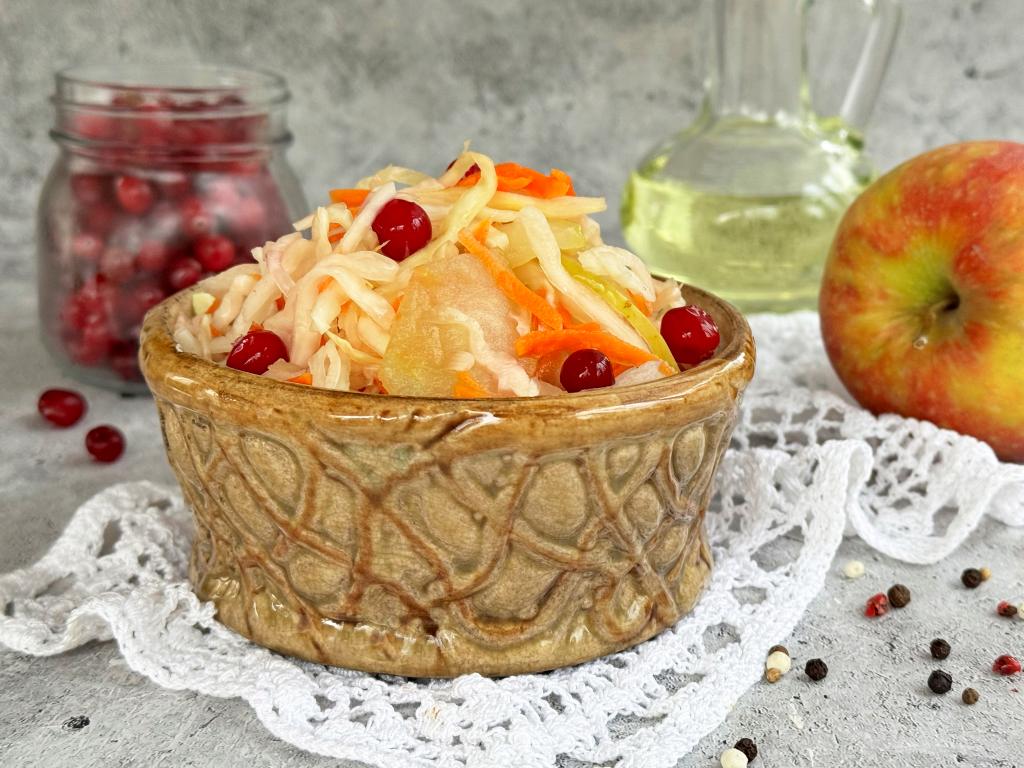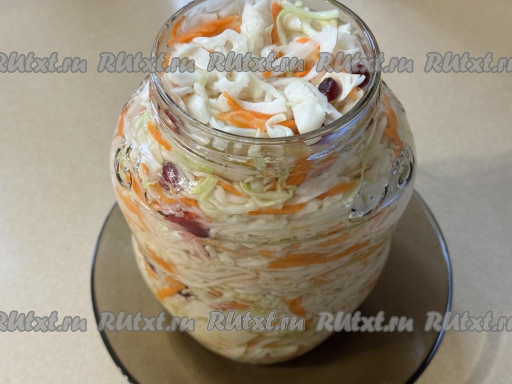 Квашеная капуста готовится несложно, а получается вкусной, полезной. В этот раз предлагаю заквасить в домашних условиях капусту с добавлением яблока, клюквы и моркови. Капуста получается очень аппетитной, вкусной, хрустящей. Клюква придаёт ей приятную кислинку. Яблоко делает вкус более насыщенным. Приготовьте квашеную капусту по этому рецепту и у вас будет замечательная закуска для вашего повседневного стола!