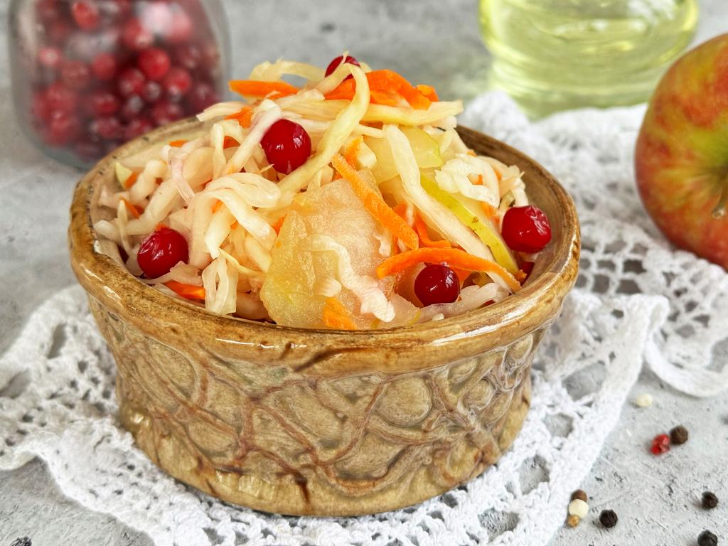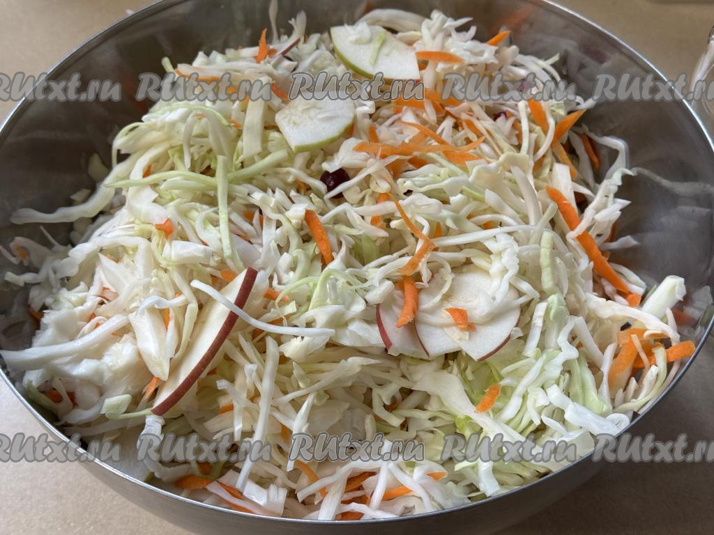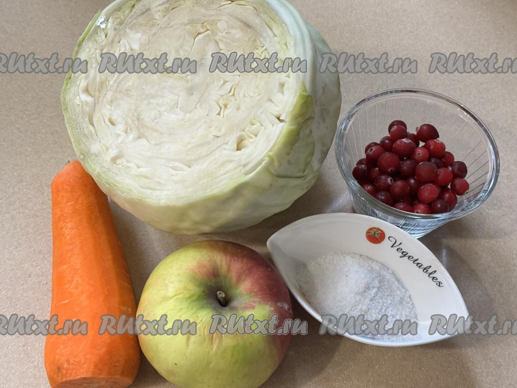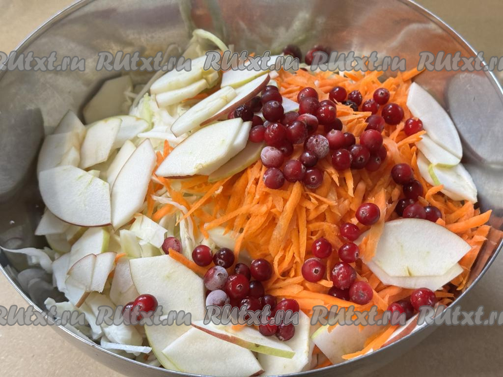 В миску с капустой выложить яблоко, морковь и клюкву.