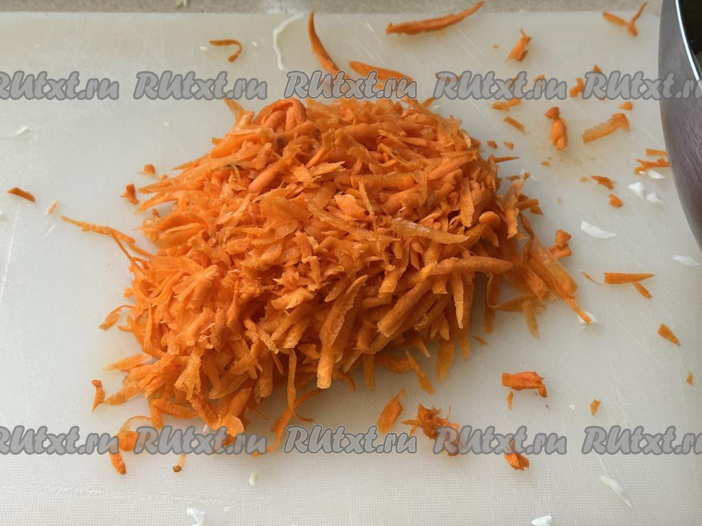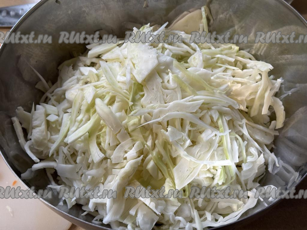 Нарезать 1 килограмм капусты на тонкие полоски, выложить в глубокую миску.