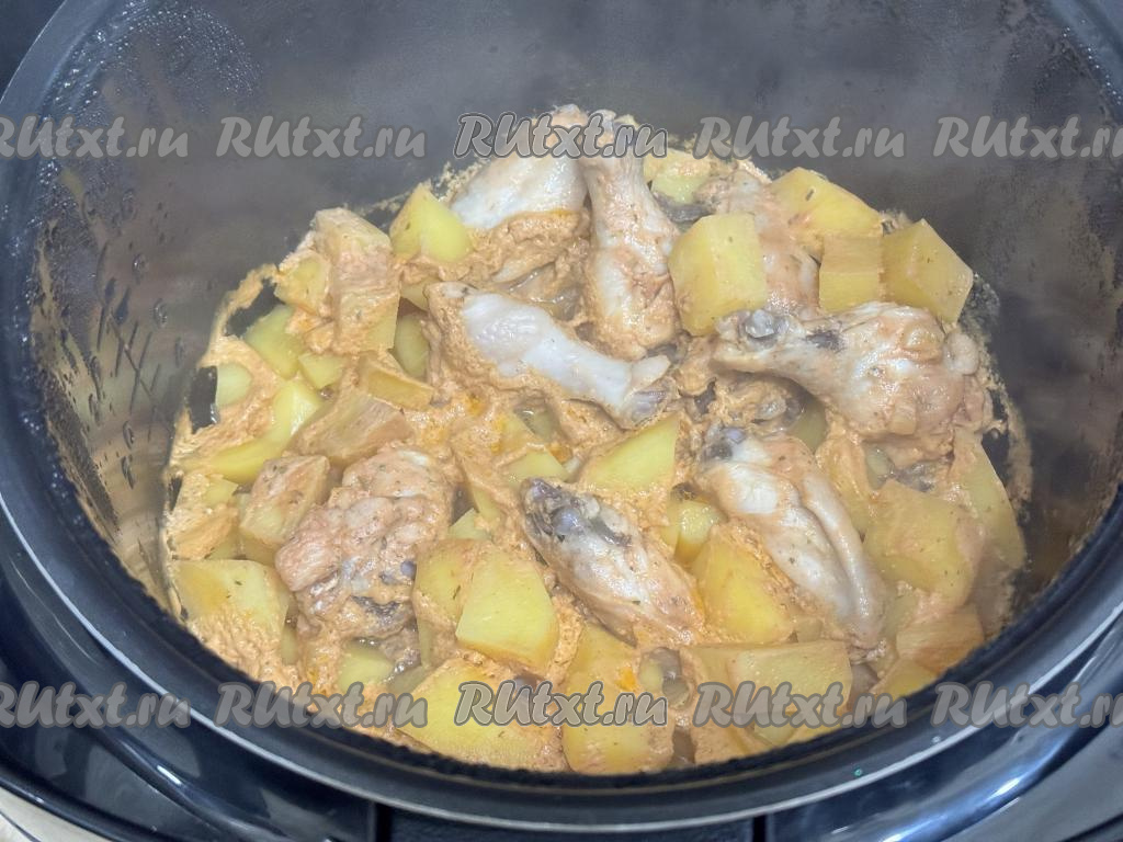 Чашу мультиварки немного смазать растительным маслом. Выложить картошку с куриными крылышками в чашу мультиварки, крышку закрыть. Выставить режим "Тушение" на 1 час.