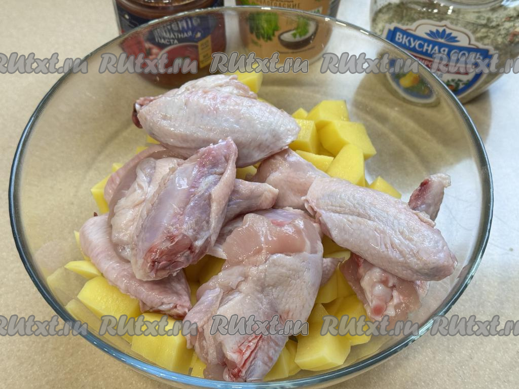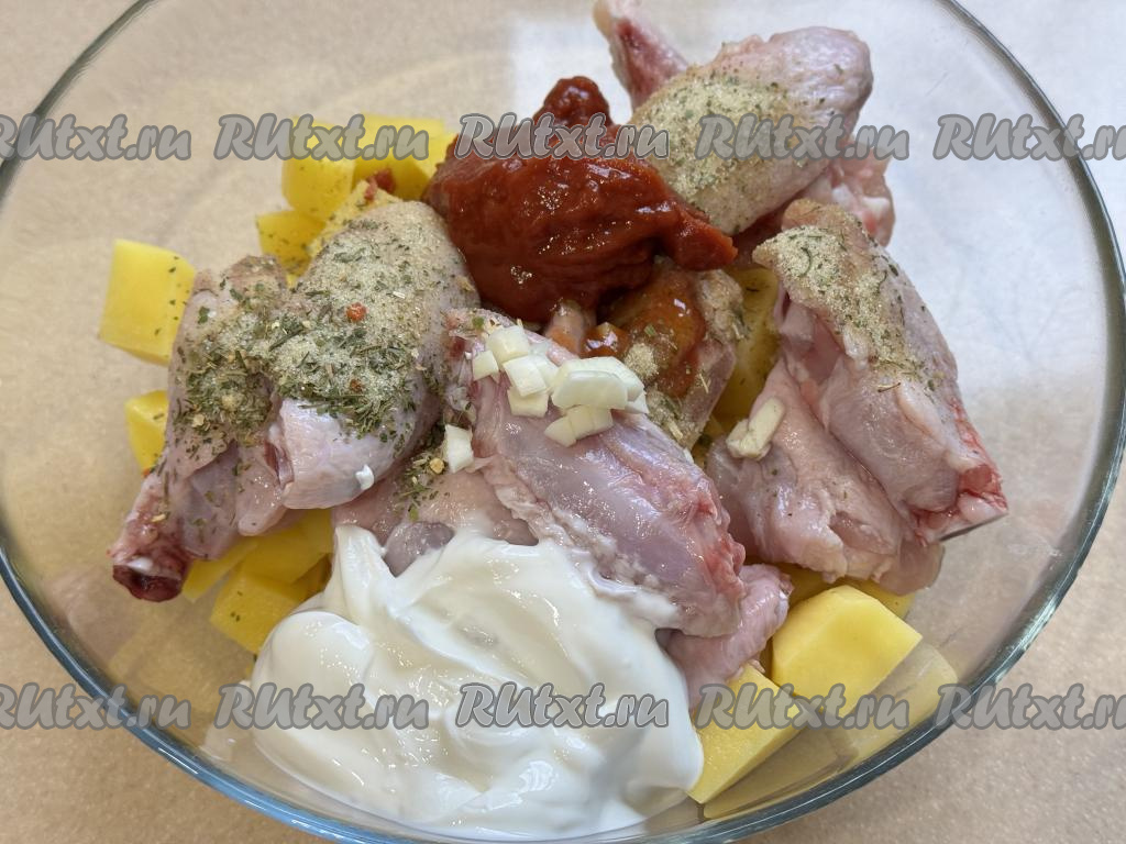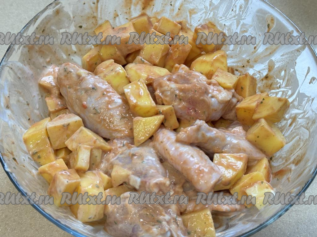 Хорошо перемешать картошку с крыльями, покрывая их томатной пастой и сметаной со всех сторон.